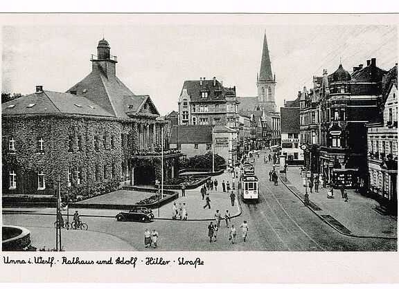 Das schwarze Schieferhaus über dem Stadtwappen ist das Haus von Otto Wülfing auf der Bahnhofstraße 19, in dem ich, Werner Wülfing, die ersten fünf Jahre meines Lebens verbrachte. Aus eigener Erinnerung weiß ich nun, dass diese Karte ein Fake sein muss. Erste Falschdarstellung: Die Straßenbahn fuhr in Wirklichkeit auf der gegenüberliegenden Straßenseite. Zweiter Fehler: Zur Zeit der Verschickung dieser Karte gab es noch keine Straßenbahn in Unna, denn diese wurde erst im November 1906 in Betrieb genommen.