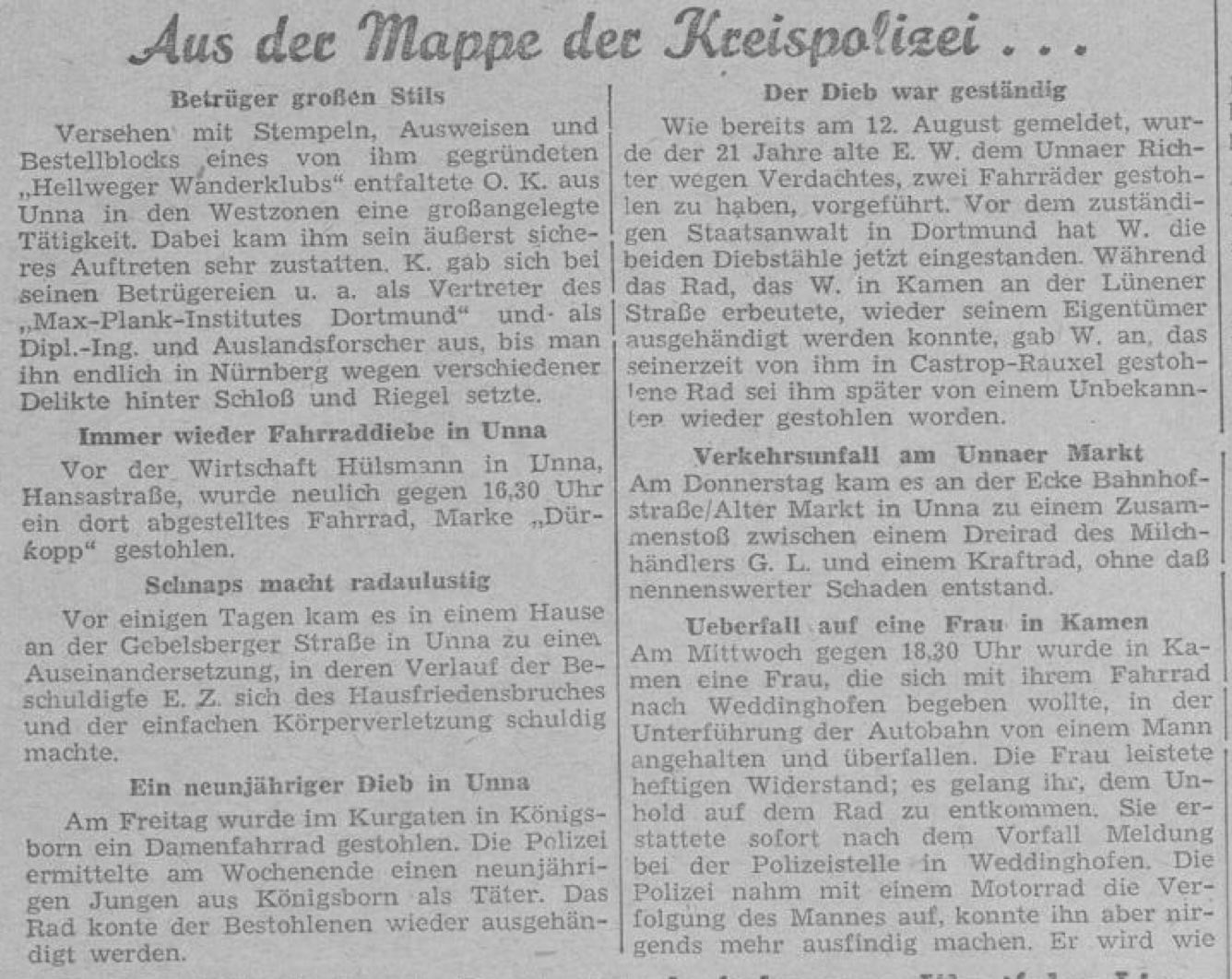So schildert ein Artikel den Diebstahl eines Fahrrads vor dem Postamt in Unna: Ein Lehrling hatte sein Rad nur kurz unverschlossen abgestellt, um Postsachen entgegenzunehmen. Als er zurückkehrte, war das Rad bereits „abgefahren“. Die Polizei riet damals: „Fahrradsicherung lohnt sich immer.“