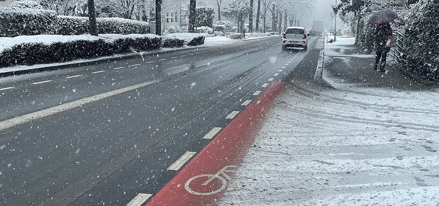 Schutzstreifen und Schneefall. © ADFC Ratingen, Manuel Wenk
