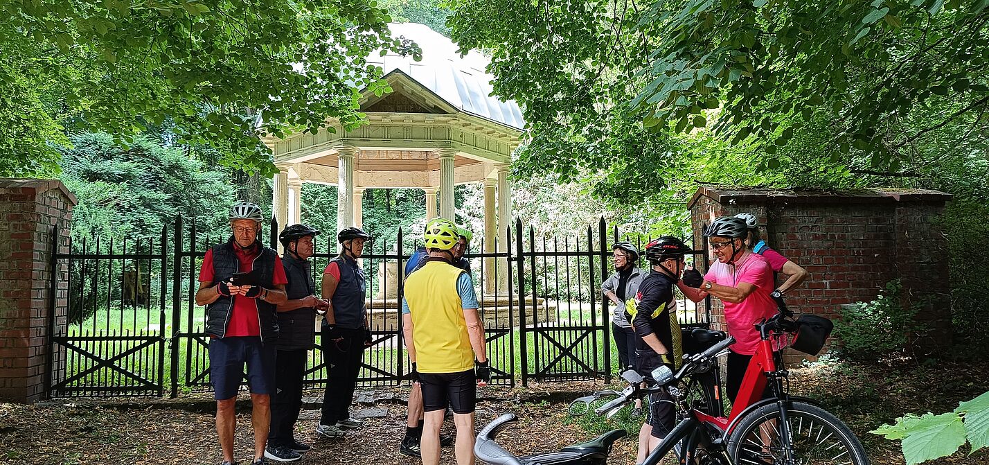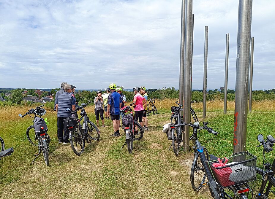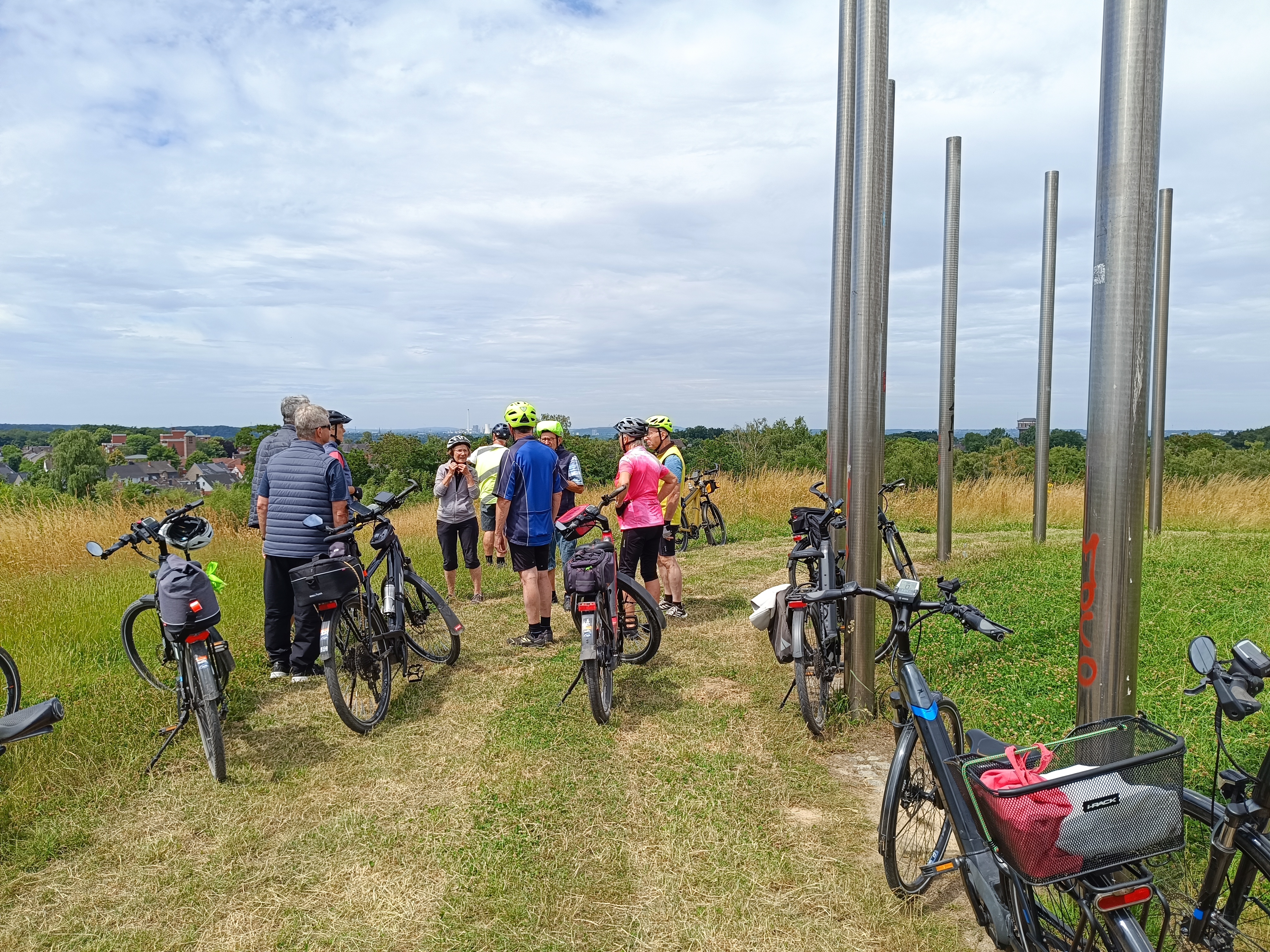 Die für den Sonntag geplante Tour musste wetterbedingt auf den Samstag verlegt werden. Zwölf Radler machten sich pünktlich um 10 Uhr auf den Weg über Hörde und den Bananenradweg durch ein lebhaftes Dortmund zum ersten Ziel, dem Dortmunder Hafen und dem alten Hafenamt. Lothar verlas dort die Zeitgeschichte über die Namensgebung der Stadt Dortmund. Weiter ging es durch das Hafengebiet an der Zeche Hansa vorbei zur Kokerei Hansa. Es lohnt sich, dort einmal eine Führung zu buchen. Das nächste Ziel am Weg war das ehemalige Schloss Westhusen, heute ein Seniorenheim. Auf Zeche Westhusen konnten wir ein einmaliges Bauwerk besichtigen, einen Förderturm der nicht aus Eisen sondern aus Stein gemauert ist. Durch Waldgebiet führte die Route zum Schloss Boldelschwingh, welches allerdings zur Zeit renoviert wird und nicht besichtigt werden konnte. Tief im Wald führte die Route an der Familiengruft derer von Boldelschwingh vorbei, auf eine der höchsten Erhebungen im Umkreis (147m), der Berghalde Schwerin mit der markanten Landmarke, bestehend aus Stahlsteelen, die eine Sonnenuhr darstellen. Ein Hauch von Stonehenge in Castrop. Endlich erreichten wir nach schöner Abfahrt das Mittagsziel, wo Lothar vorab einen Tisch reserviert hatte: Tante Amanda. Nach langer Pause und sehr gutem Essen führte die Tour zur Zeche Zollern. Ein Blick durch das Eingangstor vermittelte einen imposanten Eindruck von einem Industriedenkmal der Sonderklasse. Einige Kilometer später machten wir kurzen Halt im Innenhof von Haus Dellwig, welches baulich gesehen sehr stark an Schloss Opherdicke erinnert. Kurz vor Dorstfeld hatte Elisabeth einen Platten und mit geeinten Kräften und viel Geschick gelang es zunächst, den Schlauch zu flicken. Aber schon kurze Zeit später, auf dem Marktplatz in Dorstfeld, musste abermals repariert werden diesmal mit Pannenspray. Und auch dieser hielt nur für wenige Kilometer, sodass wieder eine Reparatur anstand. Aber selbst der neue Schlauch hatte ein defektes Ventil und letztlich musste das Rad per Auto nach Holzwickede überführt werden. Die Tourteilnehmer waren stets gut gelaunt und erfreulich geduldig, ob der langen Reperaturversuche. Die Tour bleibt in jeder Hinsicht noch lange in Erinnerung, besonderen Dank gilt der hervorragenden Organisation durch Lothar.