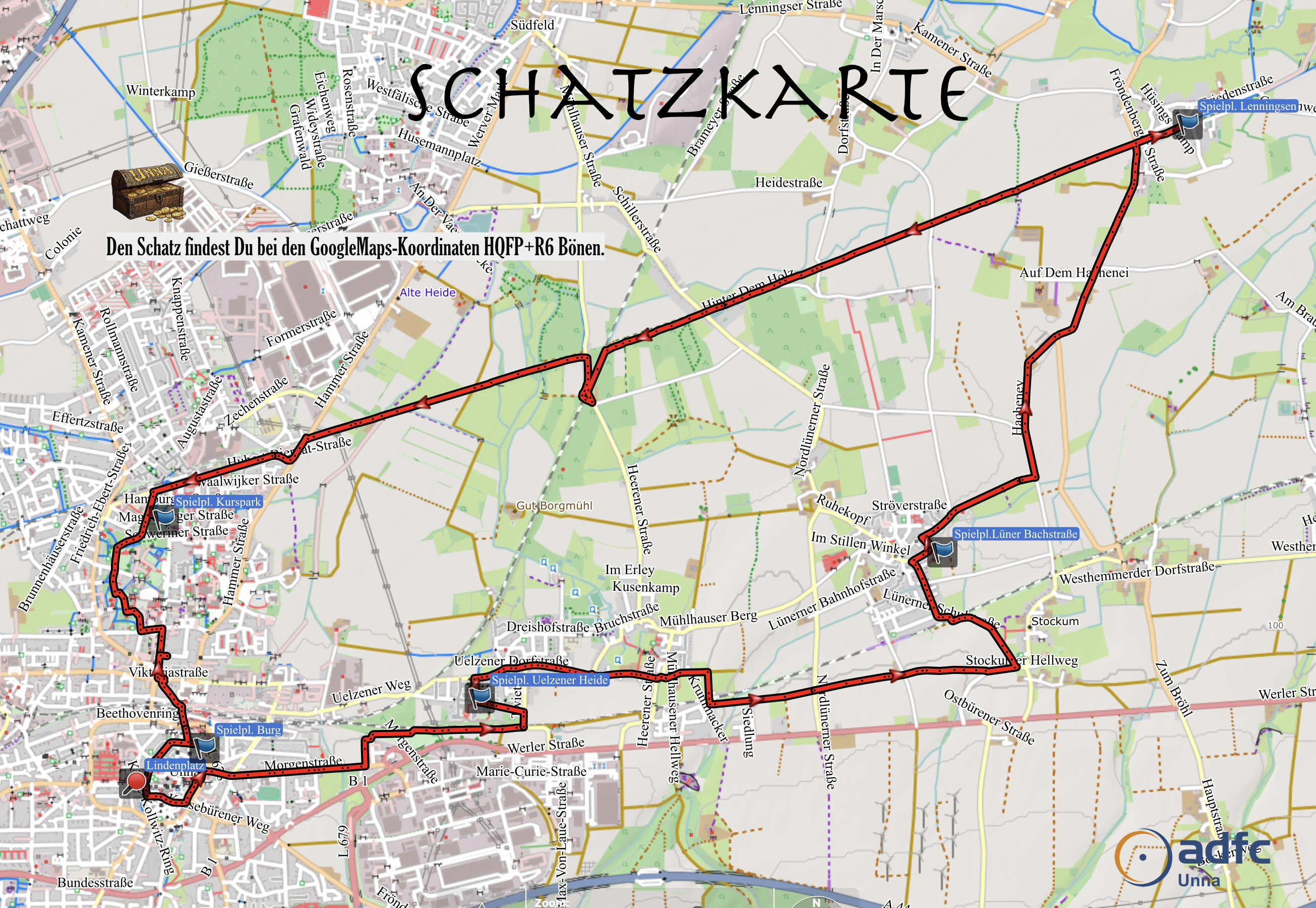 Den Schatz findest Du bei den GoogleMaps-Koordinaten HQFP+R6 Bönen.