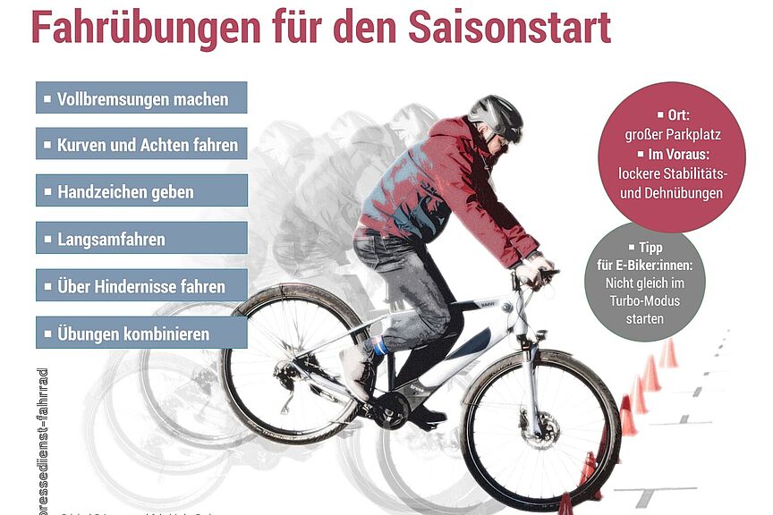 Um im Frühjahr in die Fahrradsaison zu starten, muss nicht nur das Fahrrad geputzt sein. Auch Radfahrende sollten ein wenig üben, bevor sie sich wieder aufs Rad schwingen. Der pd-f gibt Tipps, wie man schwungvoll und sicher in den Frühling startet.