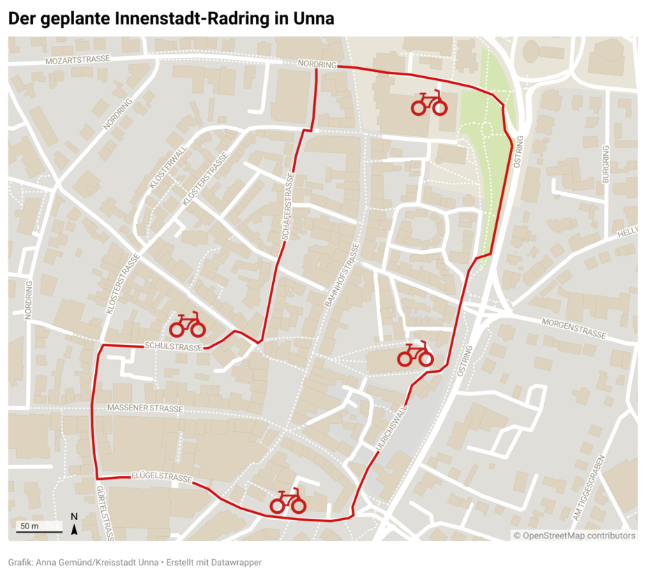 Mit dem Innenstadt-Radring sollen Radfahrende um die Fußgängerzone und um den alten Markt herum geleitet werden. So soll die Fußgängerzone sicherer werden und für Radfahrende soll sich ein schnellerer und konfliktarmer Weg um die Innenstadt ergeben.