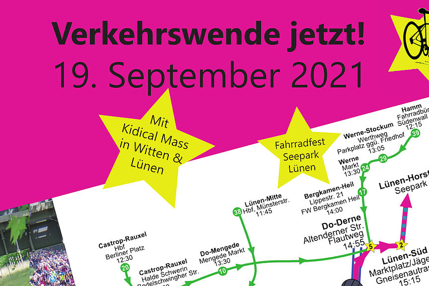 Wie schon angekündigt findet dieses Jahr die Fahrradsternfahrt Ruhr am Sonntag den 19. September 2021 statt. Die Hauptroute startet um 12 Uhr in Witten und führt über Dortmund nach Lünen zum Seepark. Darüberhinaus gibt es 12 Nebenrouten, die auf unterschiedliche Zulaufpunkte der Hauptroute führen. Sowohl bei der Hauptroute als auch bei den Nebenrouten gibt es weitere Einstiegspunkte, sodass für jeden interessierten Radfahrenden eine geeignete Streckenlänge dabei ist. Flyer und Plakat sind zum Download verfügbar. Das Material wird auch in Dortmund u.a. in der ADFC Geschäftsstelle ab dem 9.08.21 ausliegen.